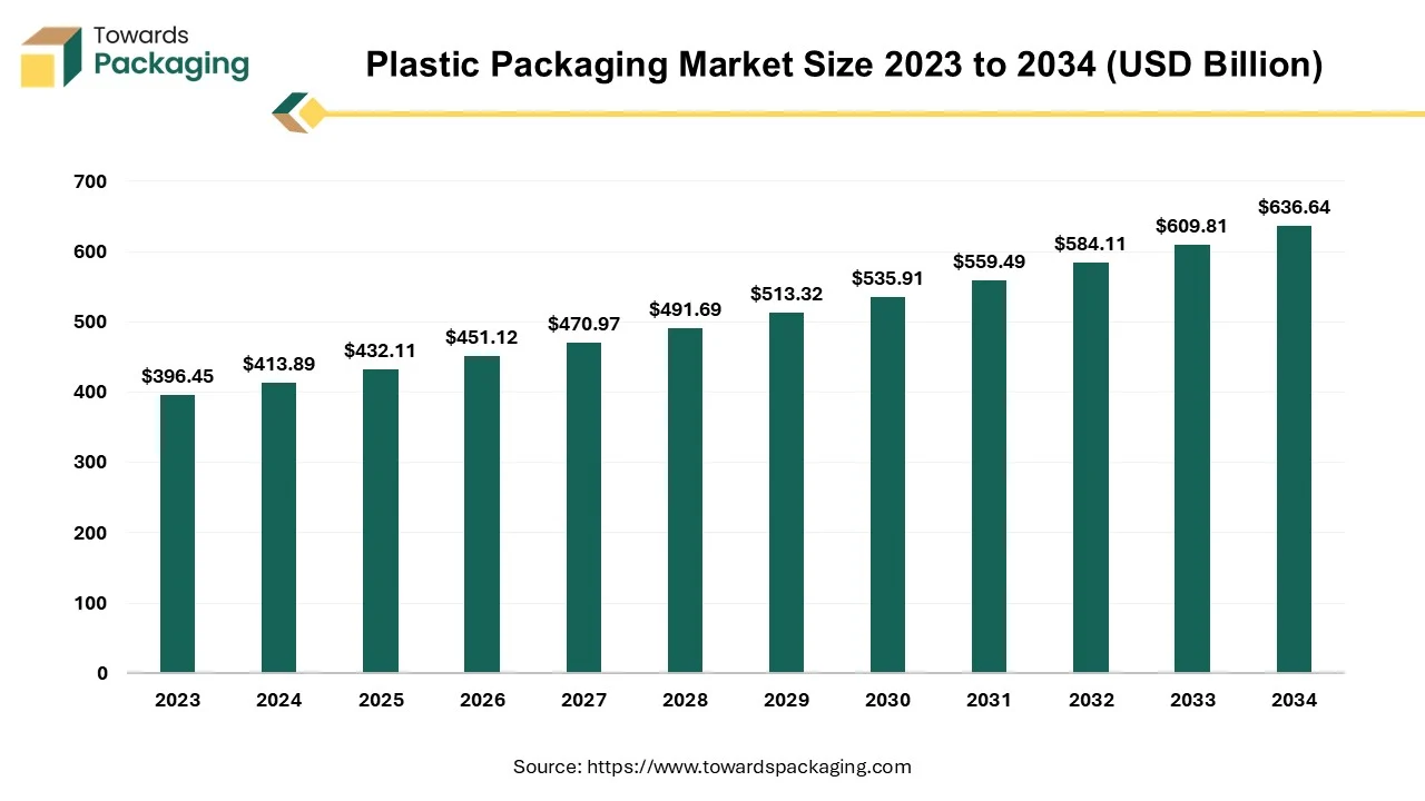 As highlighted by Towards Packaging research, the global plastic packaging market, valued at USD 432.11 billion in 2025, is expected to reach USD 636.64 billion by 2034, registering a CAGR of 4.4% throughout the forecast period.